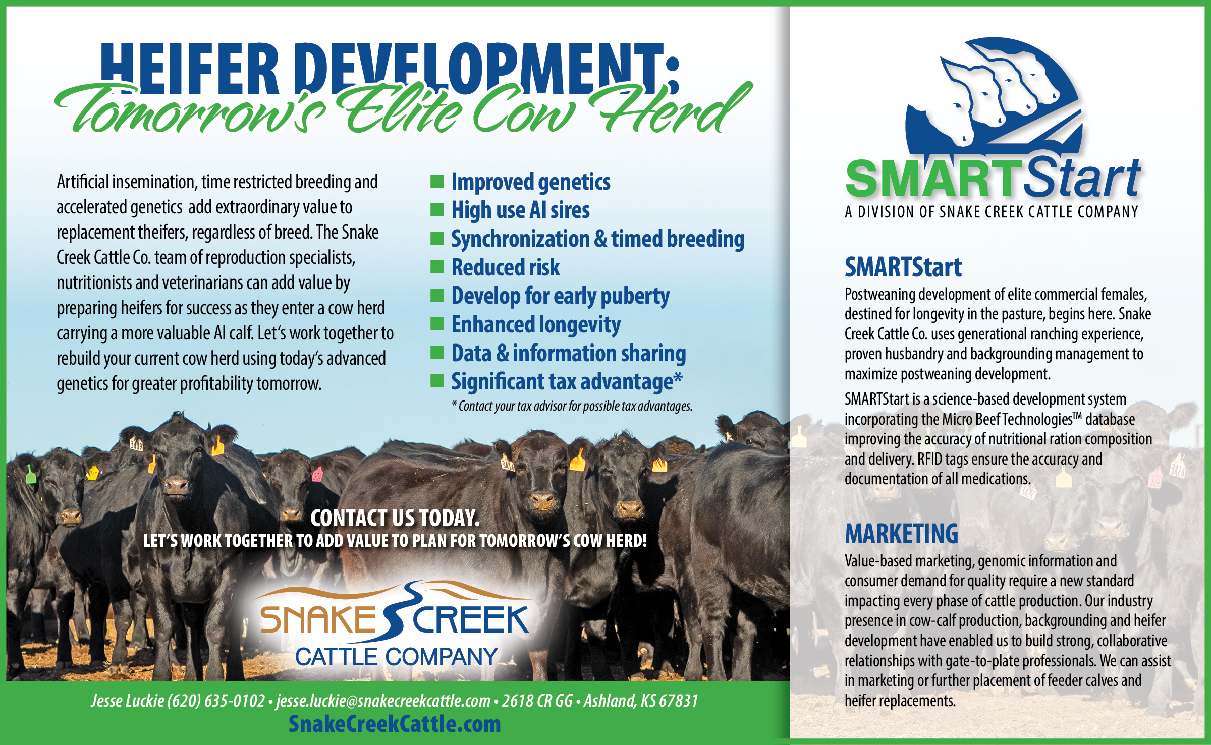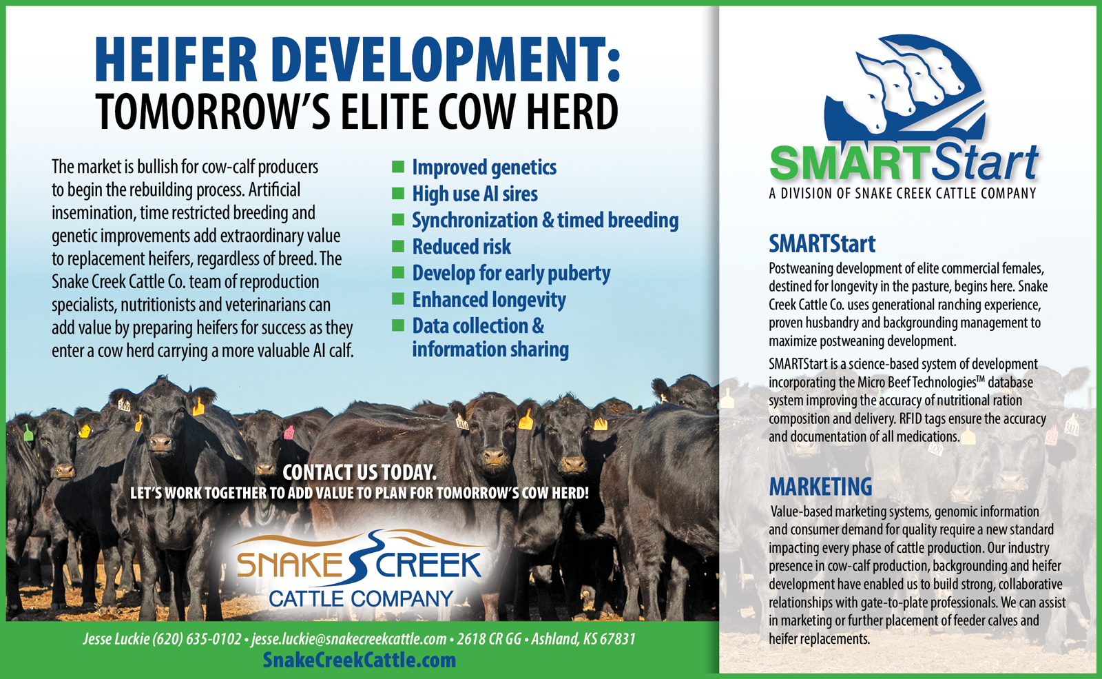 Snake Creek Ranch’s SmartStart development facility offers clients the flexibility to background lighter, younger cattle or develop heifers to either return to the cowherd as replacements or, for non-breeders, move on to a feedlot setting.